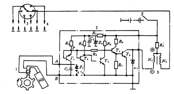 压而导通。此时P 点电位降低,于是T2 截止。当T2 截止时,蓄电池通过R2 向T3 提供偏流,使T3 导通, T3 和T4 立即截止,点火线圈初级电流被切断,次级绕组N2 产生高电压。此电压再由分电器分配至各缸火花塞使之跳火,点燃可燃混合气。